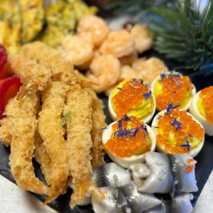 Kanape BBQ sealiha, bataatkreemi ja seenesalatiga