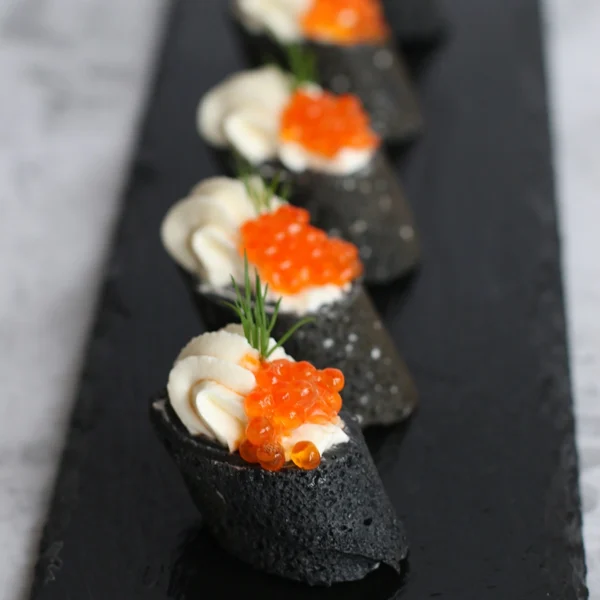 Канапе с BBQ свининой, с кремом из батата и грибами